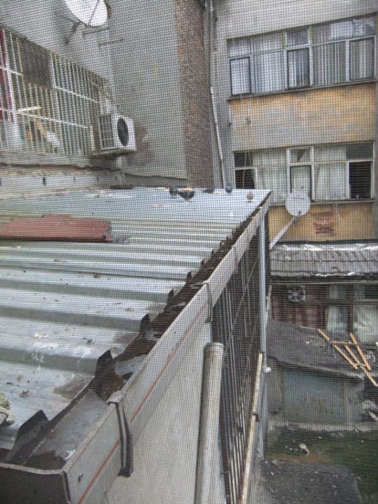 Tauben werden auf dem Blechdach mit Weißbrot gefüttert. Gerüche und Geräusche Tag und Nacht. Undefinierbare schimmernde, ölige "Chemiebrühe" in der Dachrinne in Höhe der Fensteröffnung!