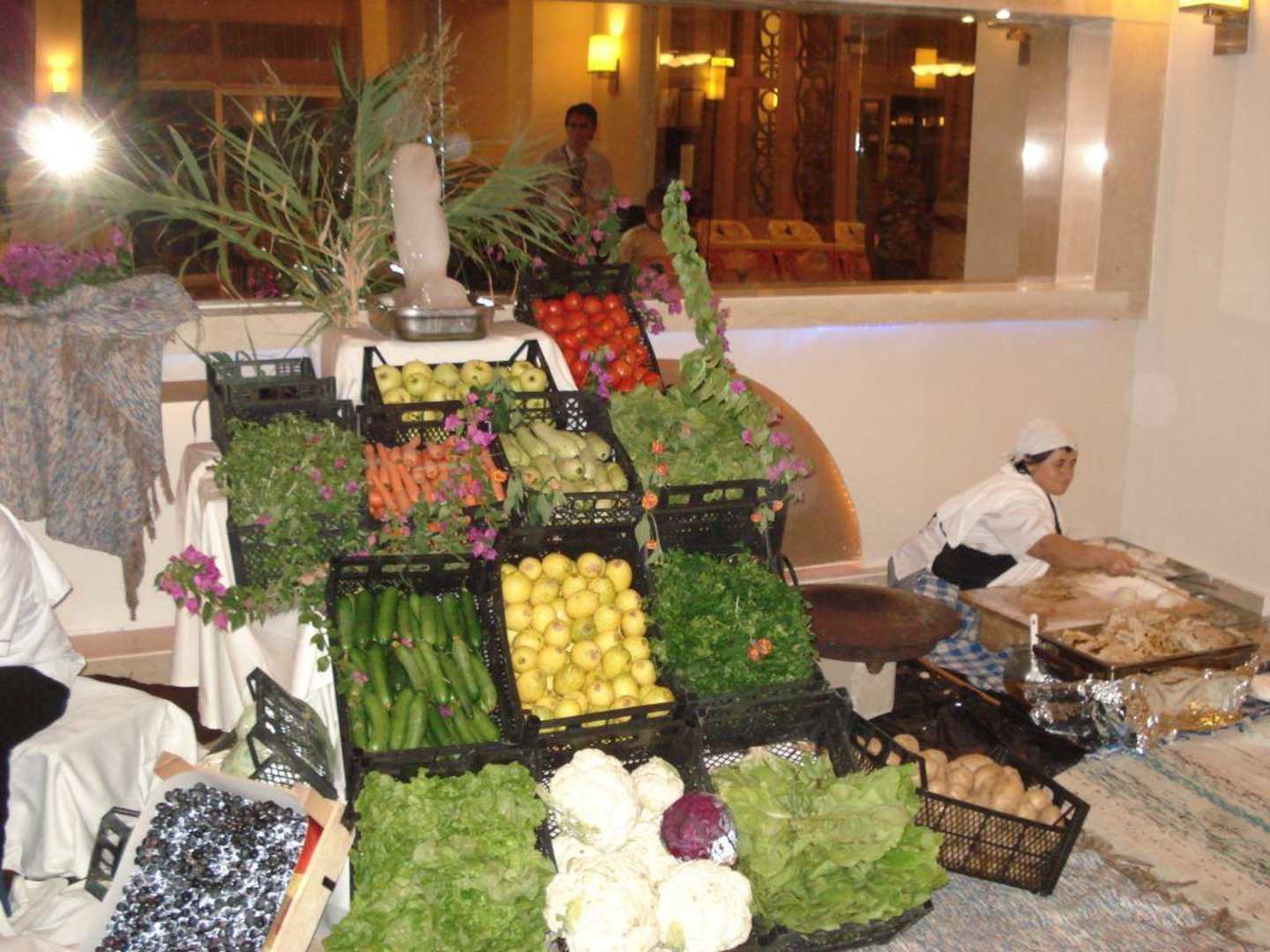 Restaurant am ZuckerfestEine Frau backte Fladen und ein riesiger Gemüsestand dekorierte das Restaurant.