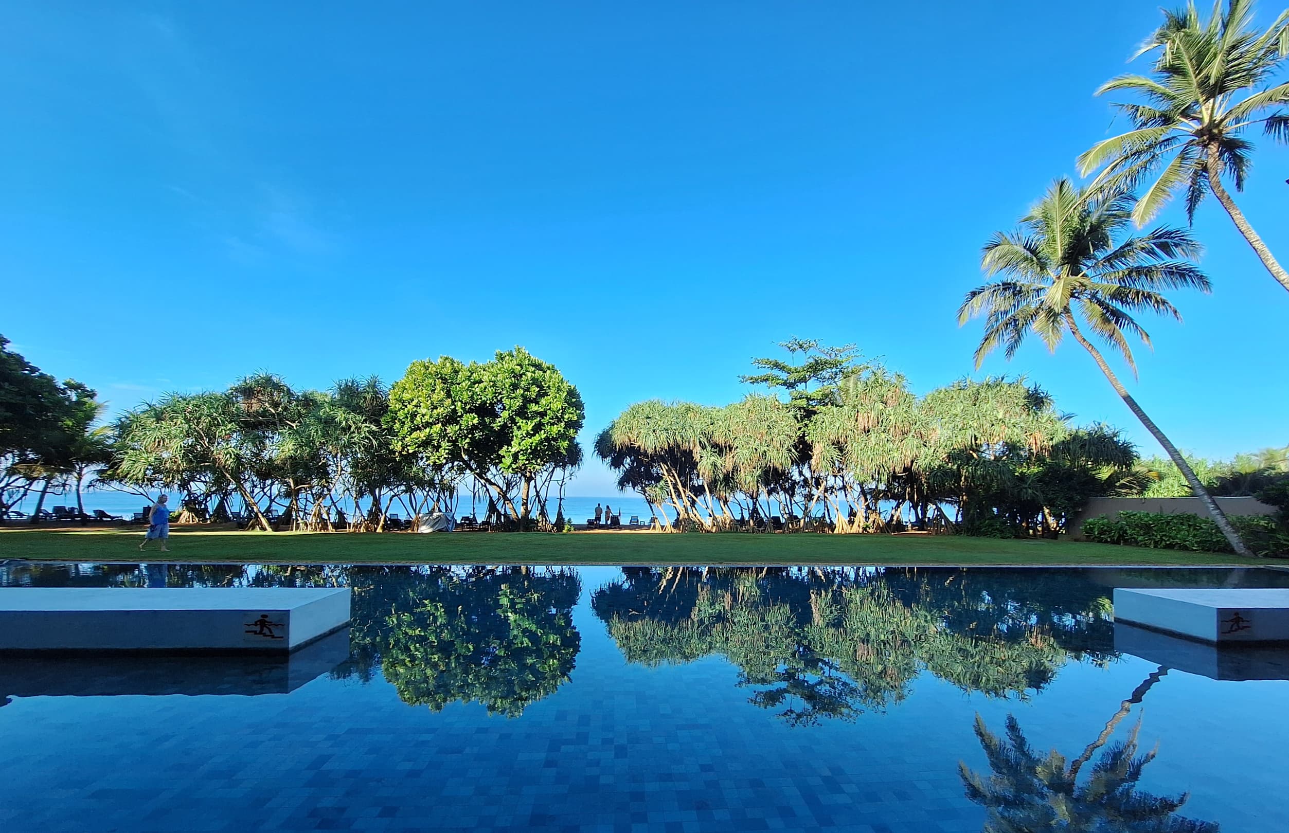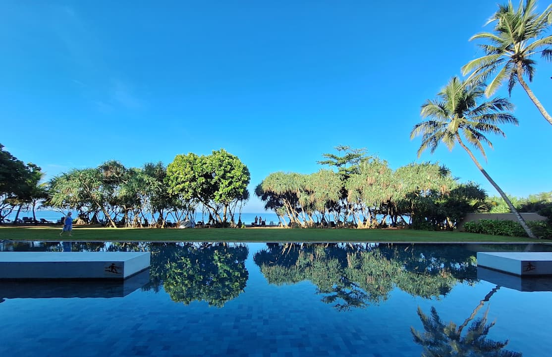 Pool und Strand von der Lobby aus gesehen