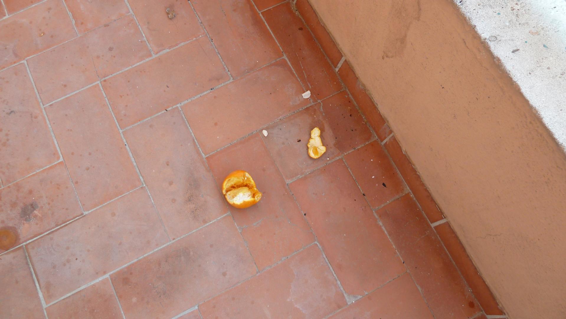 Orangenreste auf dem BalkonNachts fliegen offenbar Essensreste aus anderen Zimmern oder von der Straße auf die Balkone