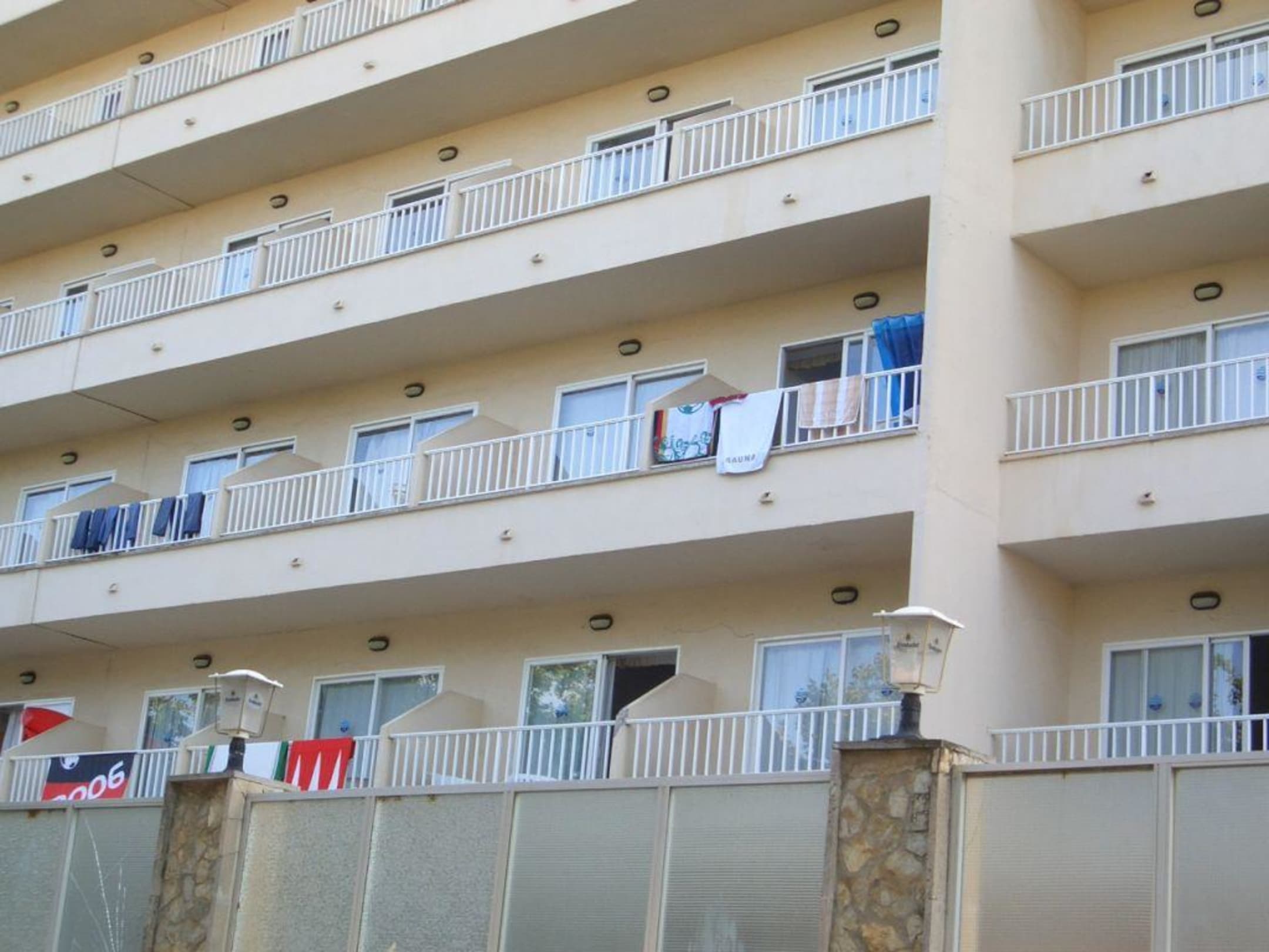 HotelfrontSicht von der Straße aus über Pool-Sicht-Schutz hoch zu den Zimmern