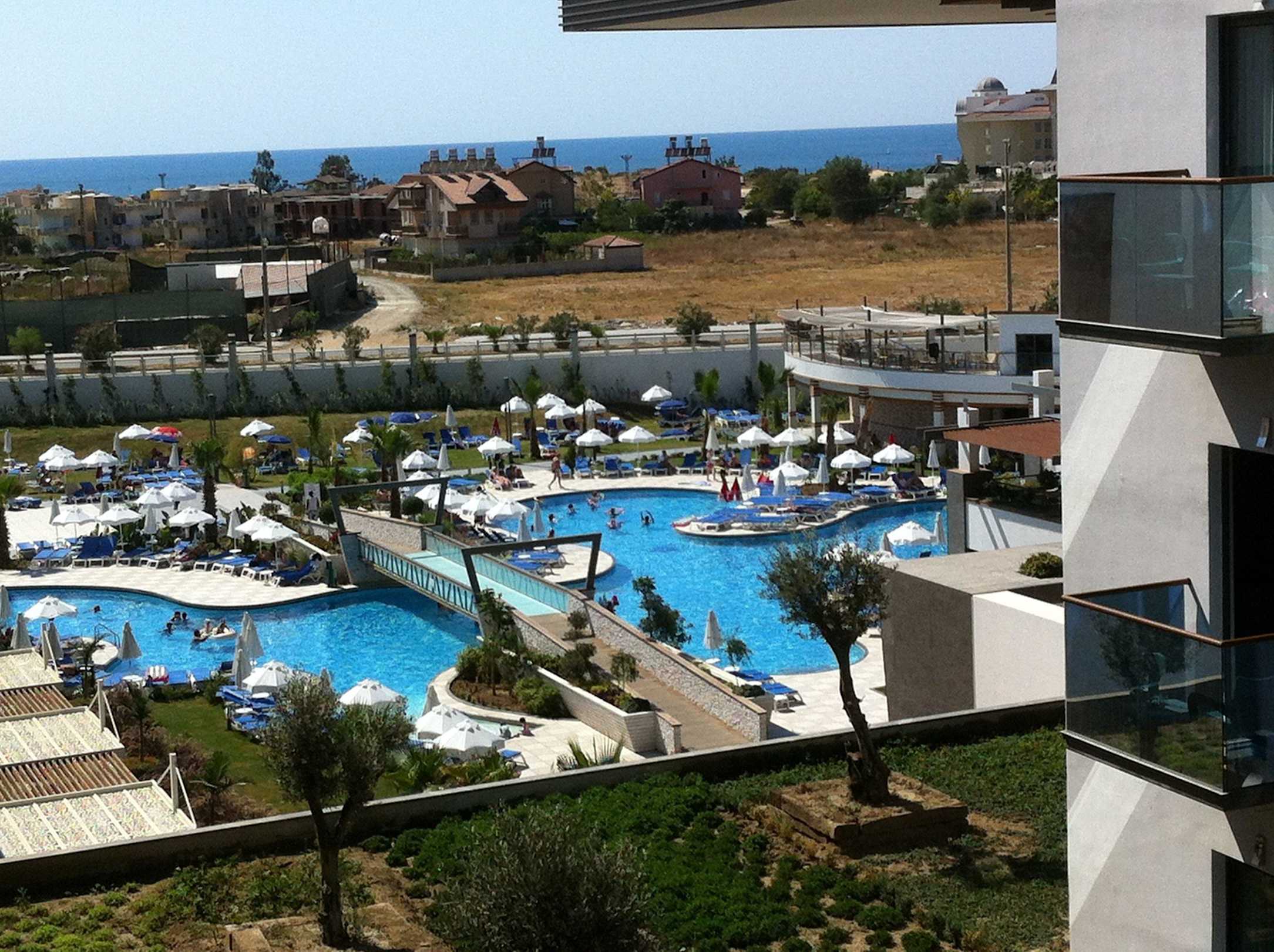 Blick auf den Pool aus dem Zimmer .