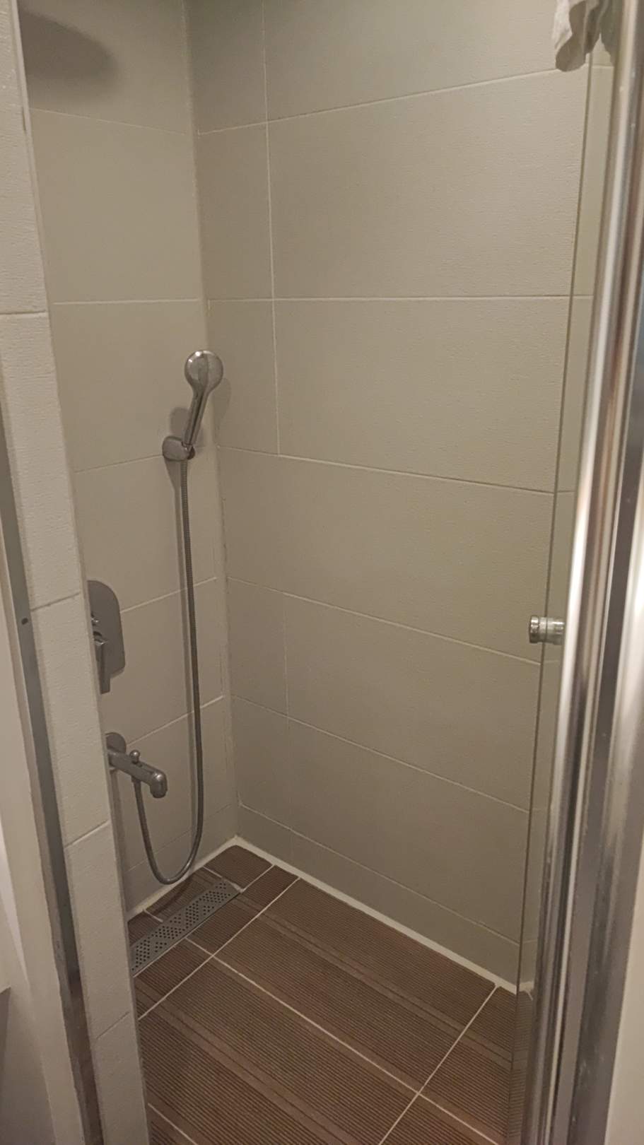 Das ist die besagte Minidusche im Familienzimmer, ebenfalls mit Glastür. Die übri Gens 7 Tage nicht geputzt wurde. Der Haarbüschel in der Dusche lag seit dem ersten bis zum letzten Tag dort🤮
