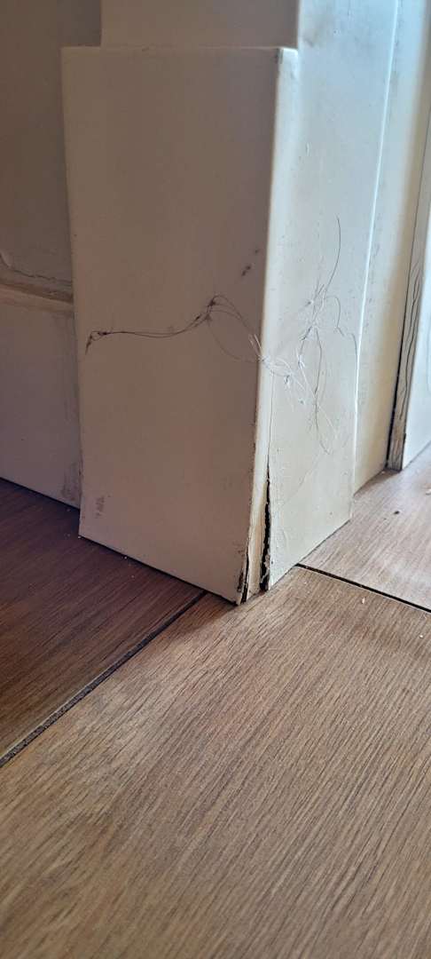Haare überall und gewölbter Boden mit rissen in der Wand.