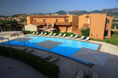 Blick auf den Pool und einen Teil der Hotelanlage