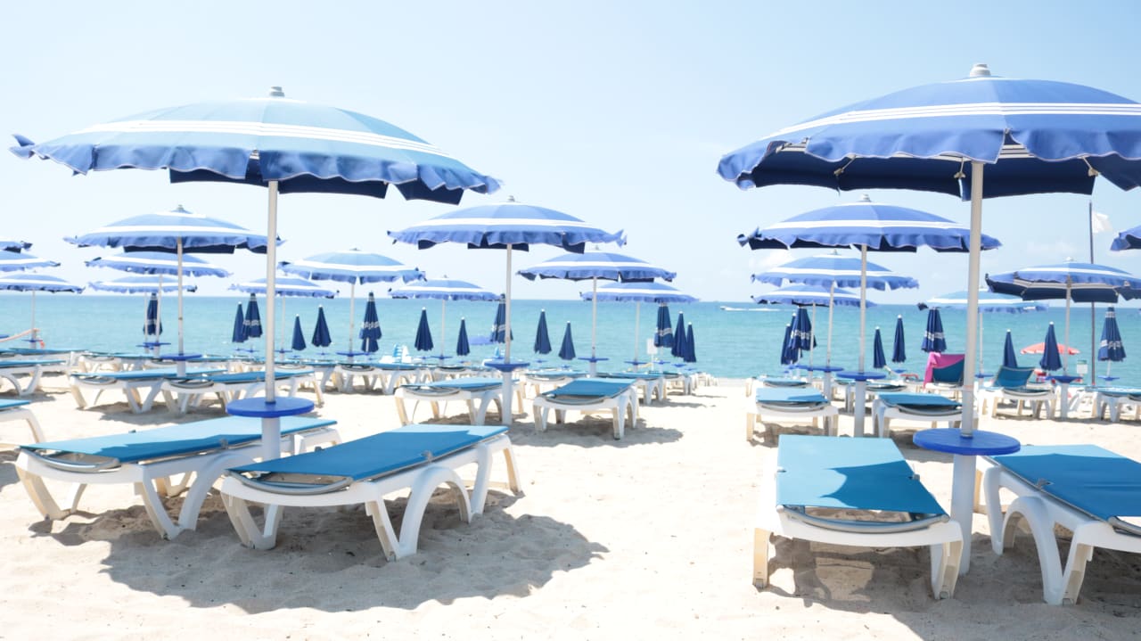 StrandStrandbereich mit ausreichend Liegen und Schirmen. der Sandstrand im Liegenbeich geht zum Wasser hin in einen Kiesstrand über.