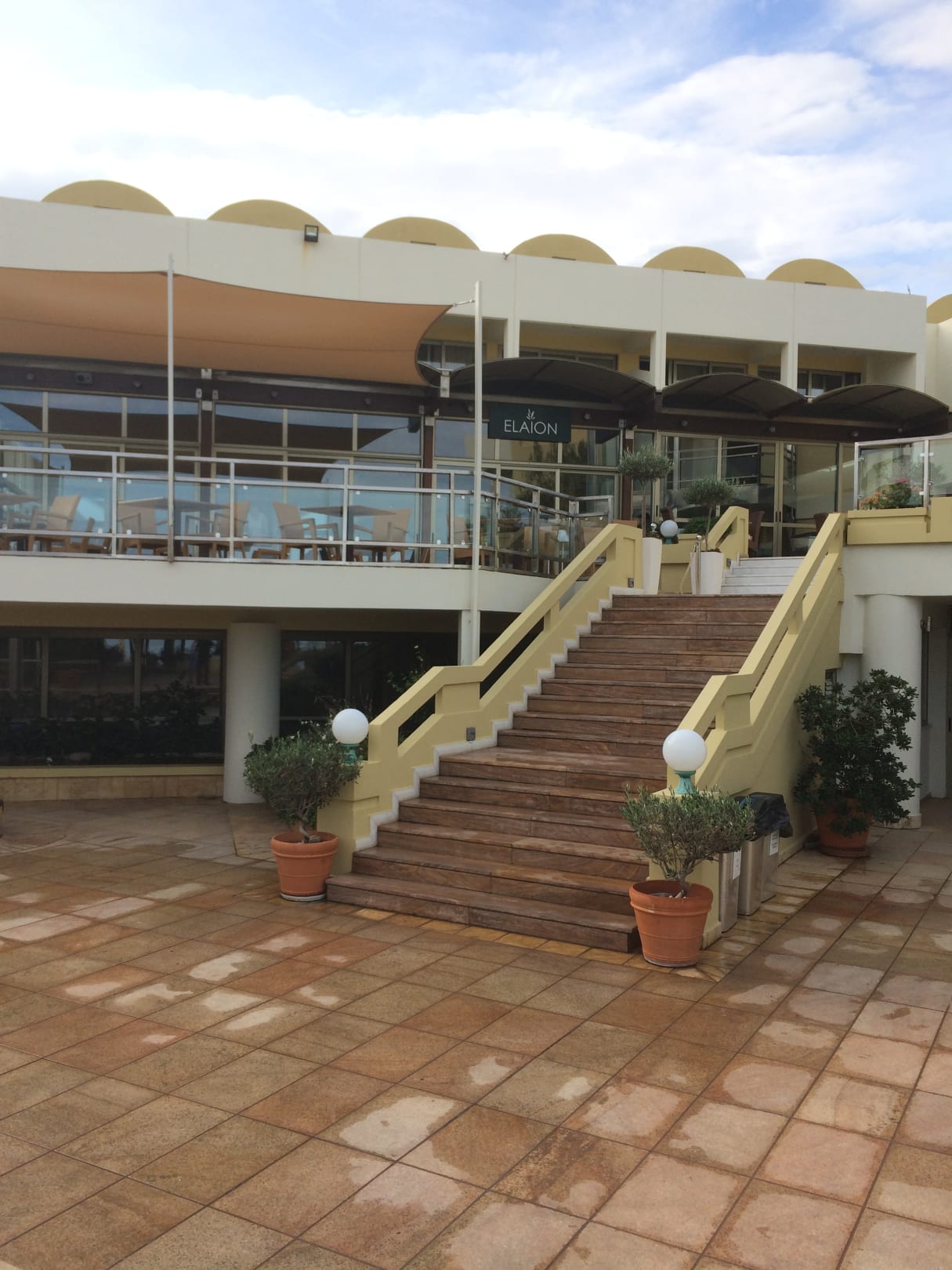 Treppe vom Innenhof ins Haupthaus mit Restaurant