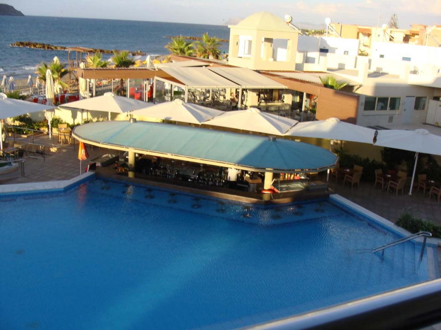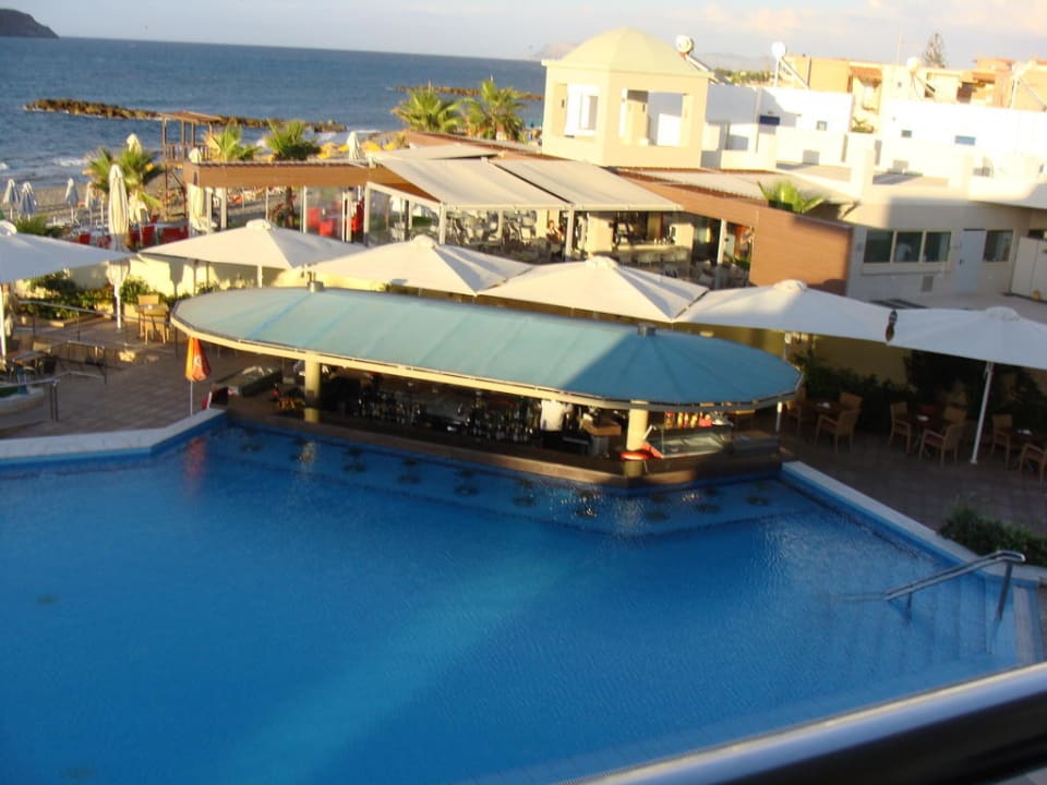 Blick vom Balkon auf Poolbar und Swimmingpool