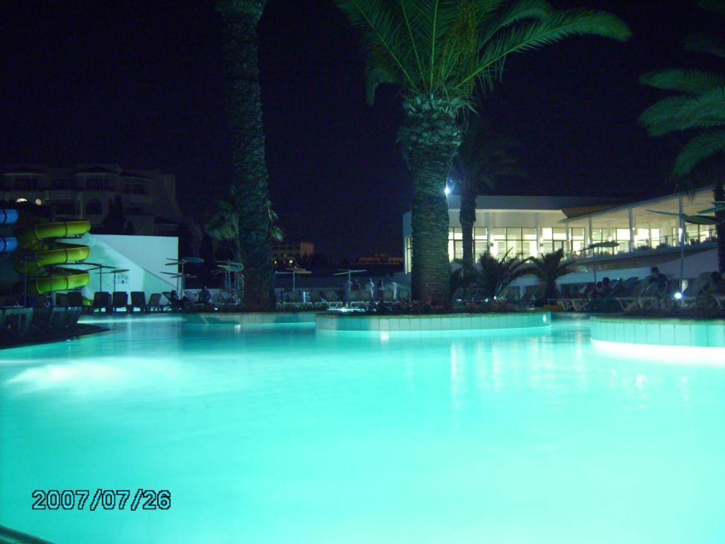 Poolsehr schönes Bild: der große Pool, der am Abend beleuchtet ist. Rechts im Bild ist der Speisesaal...