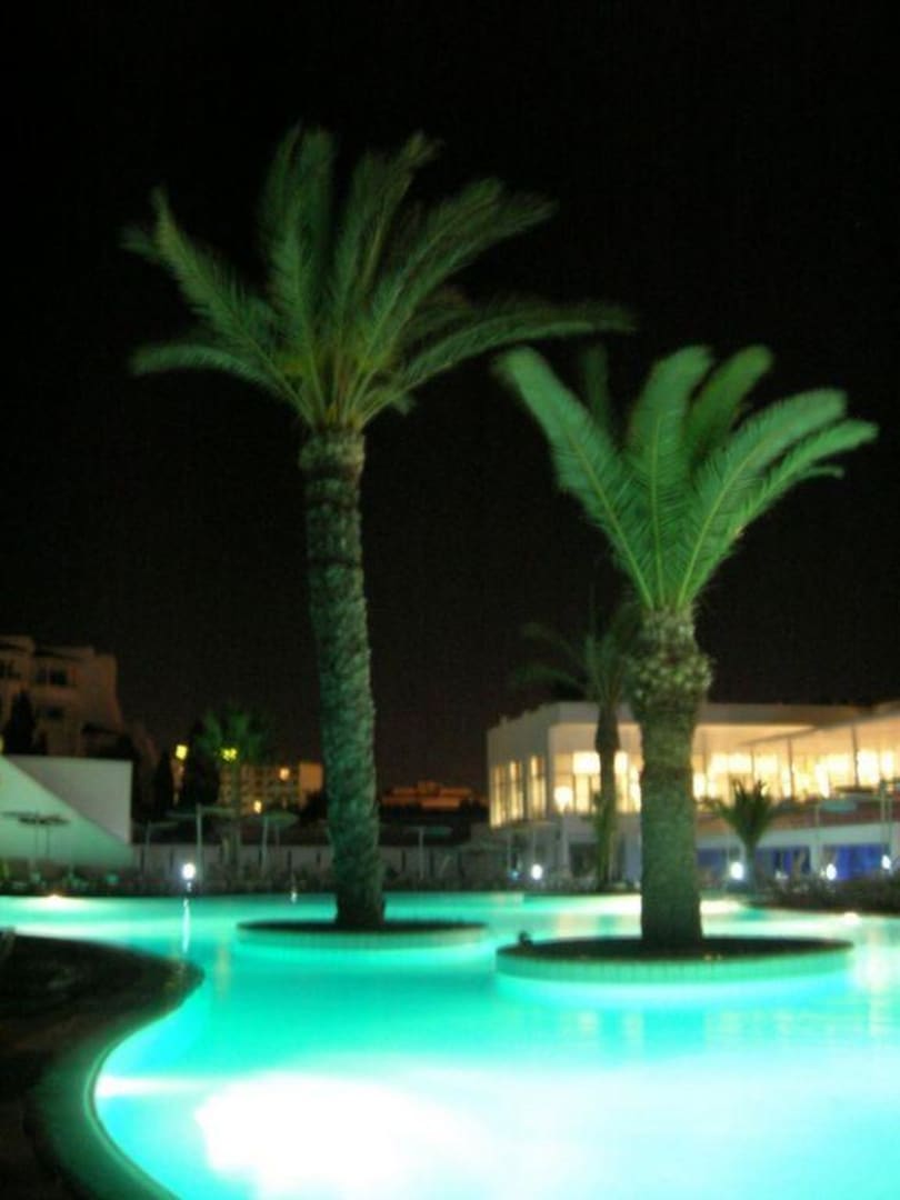 Une petite partie de la piscine, en arrière plan, le restaurant façon cafétéria