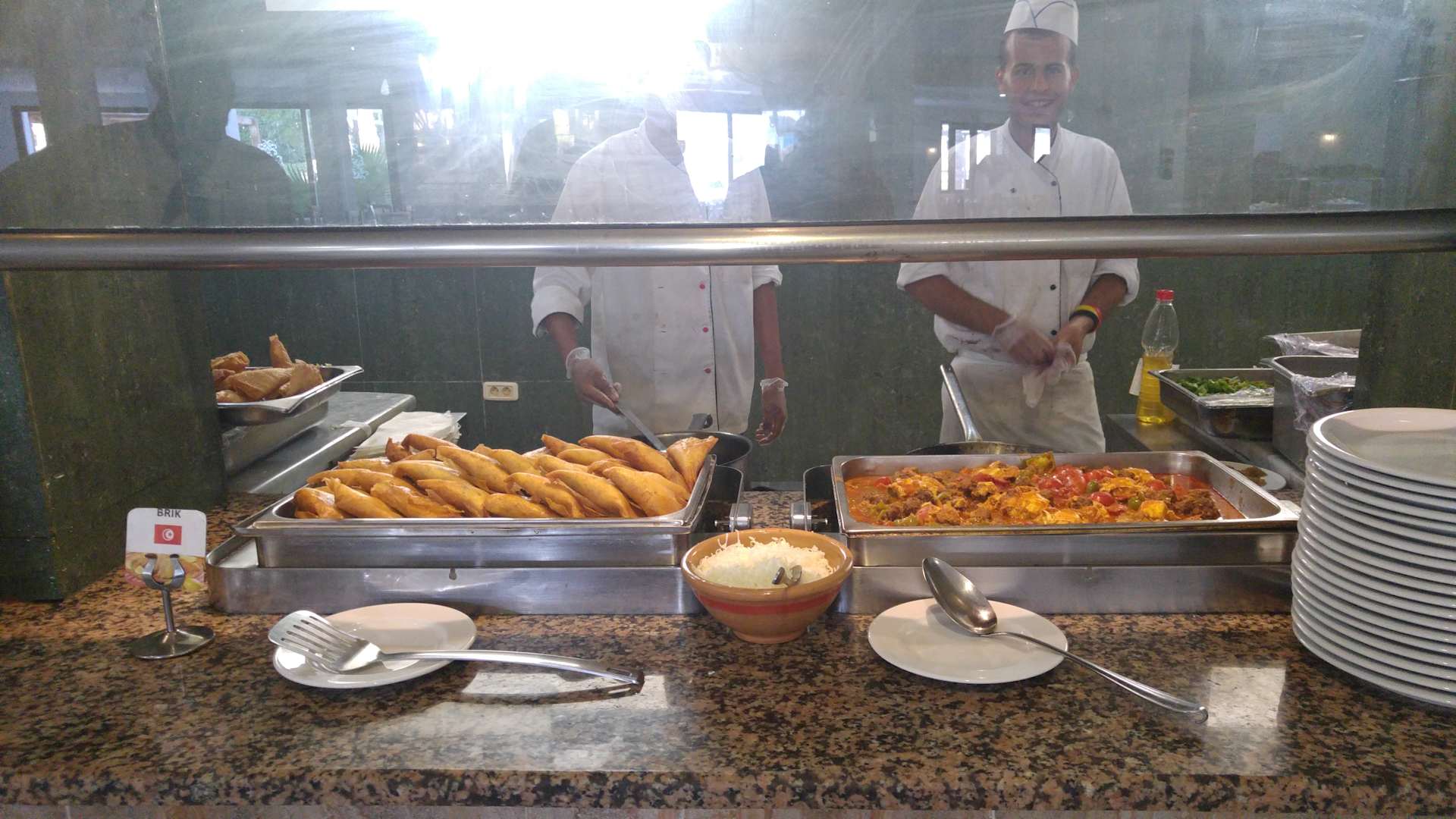 RestaurantAn den offenen Büffetfenstern wird man noch zusätzlich gut und lecker versorgt...vom Truthan bis zum Grillfisch...frisches Gemüse leicht gedünstet...Fladenbrote...Brik...immer wieder etwas anderes an kulinarischen Köstlichkeiten zu entdecken 😃😃👍👍