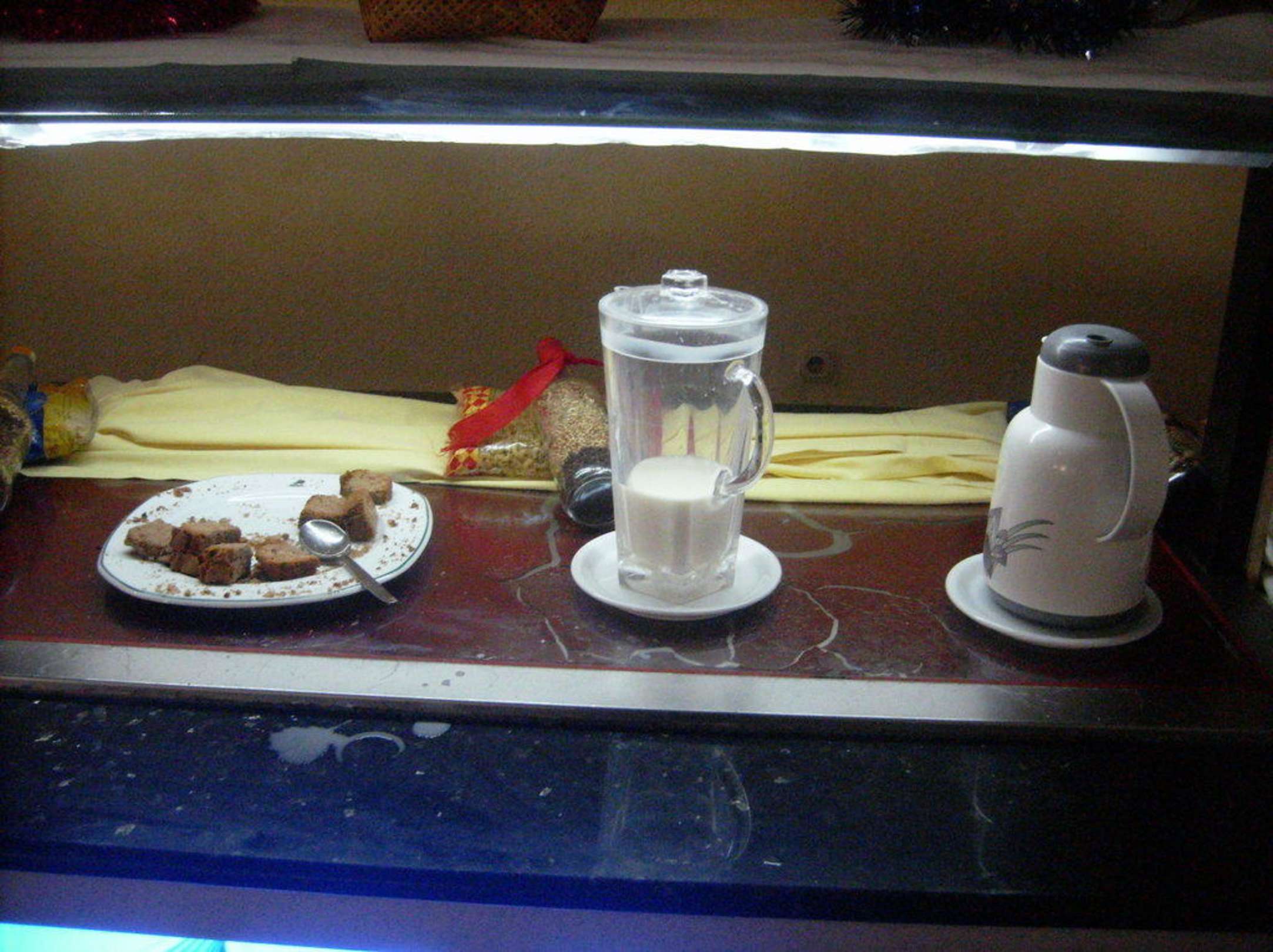 kalte Milch und Kuchenstücke