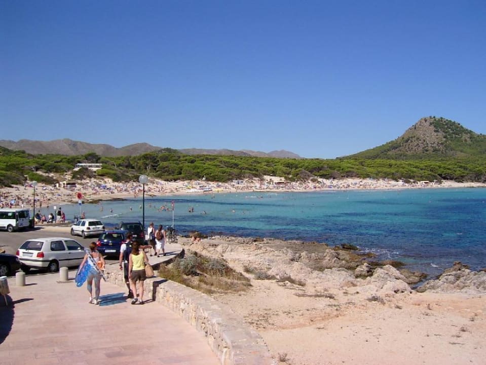 Blick auf die Bucht Cala Aguilla in Cala RatjadaNach ca. 700 Meter Fußmarsch erreicht man die Bucht Cala Aguilla vom Hotel Cala Lliteras aus. Wie man sieht ist dieser Strand immer recht voll, aber im Gegensatz zu den anderen beiden (kleineren) Buchten in Cala Ratjada noch betretbar in der Saison.