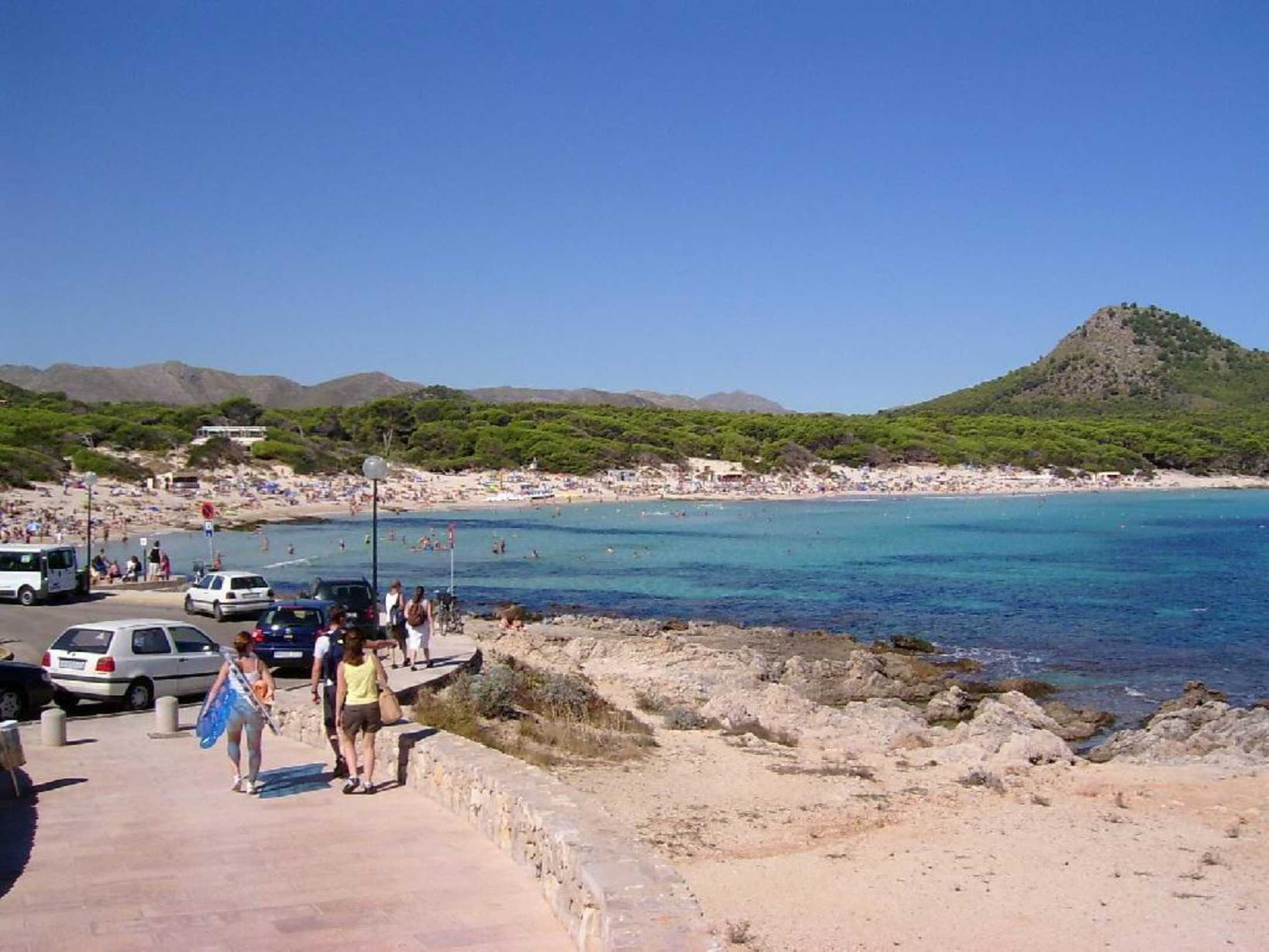 Wer gut zu Fuß ist, geht am Strand entlang und dann dahinter über den Weg durch den Pinienwald zwischen den beiden Gipfeln (hier nur der linke zu sehen) hindurch und kommt zur Cala Mesquida. Dort lässt sich noch eher ein ruhiges Plätzchen in den Dünen finden (Im Wald den lila Markierungen an den Bäumen folgen).