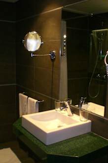 Badrechte Wand, mit schönem Waschbecken und sehr guten Vergrößerungsspiegel zum Schminken, sehr frauenfreundlich