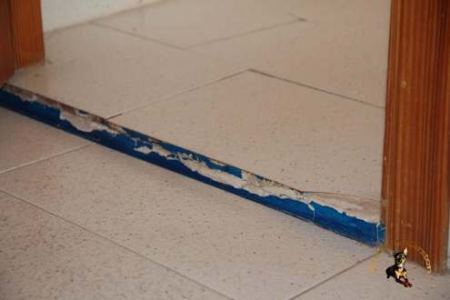 Stolperfalle im Bad mit hoher Verletzungsgefahr, lose Fliesen, jede 2. Fliese wackelt und die Kante ist auch nicht fest - Also Achtung beim Betreten.