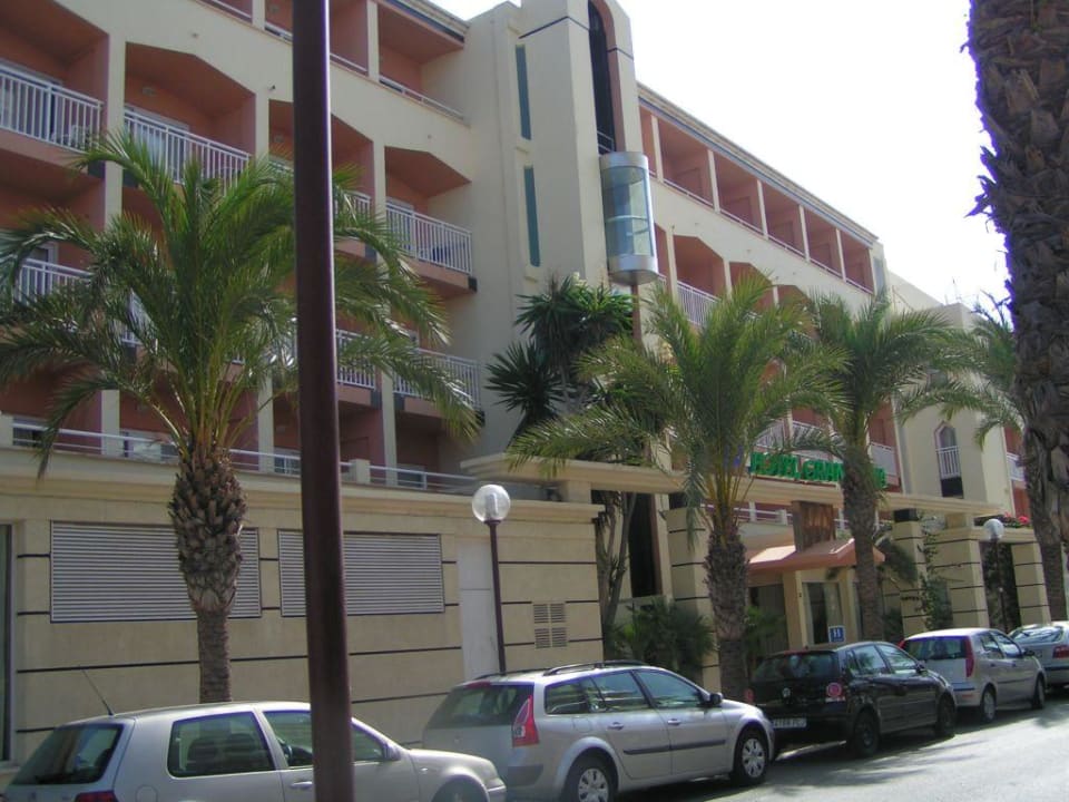 Die Frontseite des Hotels von der belebten Hauptstraße von Can Picafort.