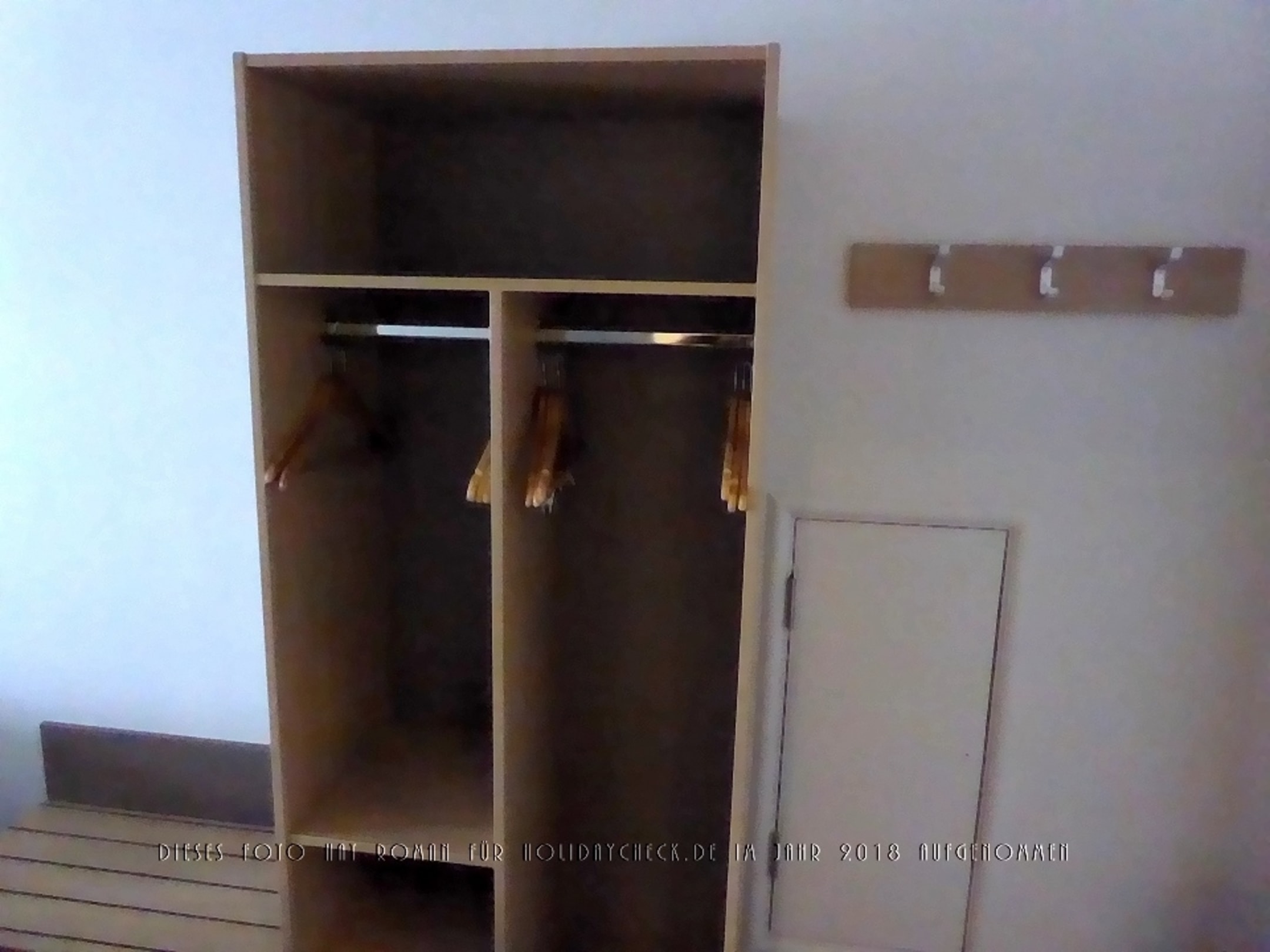Ein einfacher Kleiderschrank ohne Türen, eine Garderobe mit drei Haken.