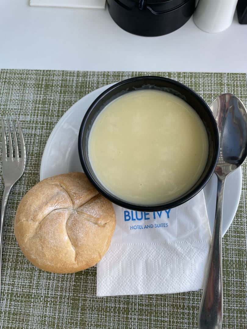 Suppe. Echt, püriert, nicht aus Pulver. Solche natürlichen Suppen haben wir nur in diesem Hotel und zu Hause gegessen. Zum Mittagessen wird ein warmes Brötchen zur Suppe serviert.