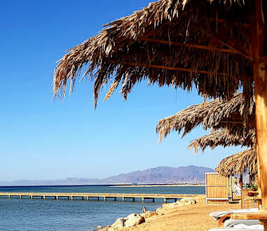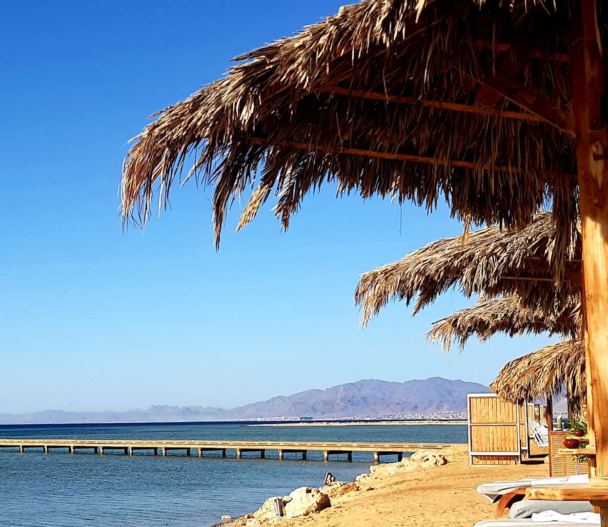 StrandAm Strand, Holzliegen, Windschott, Palmenblätterschirme, Entspannung pur! Hier sieht man auch ein Stück vom Steg.