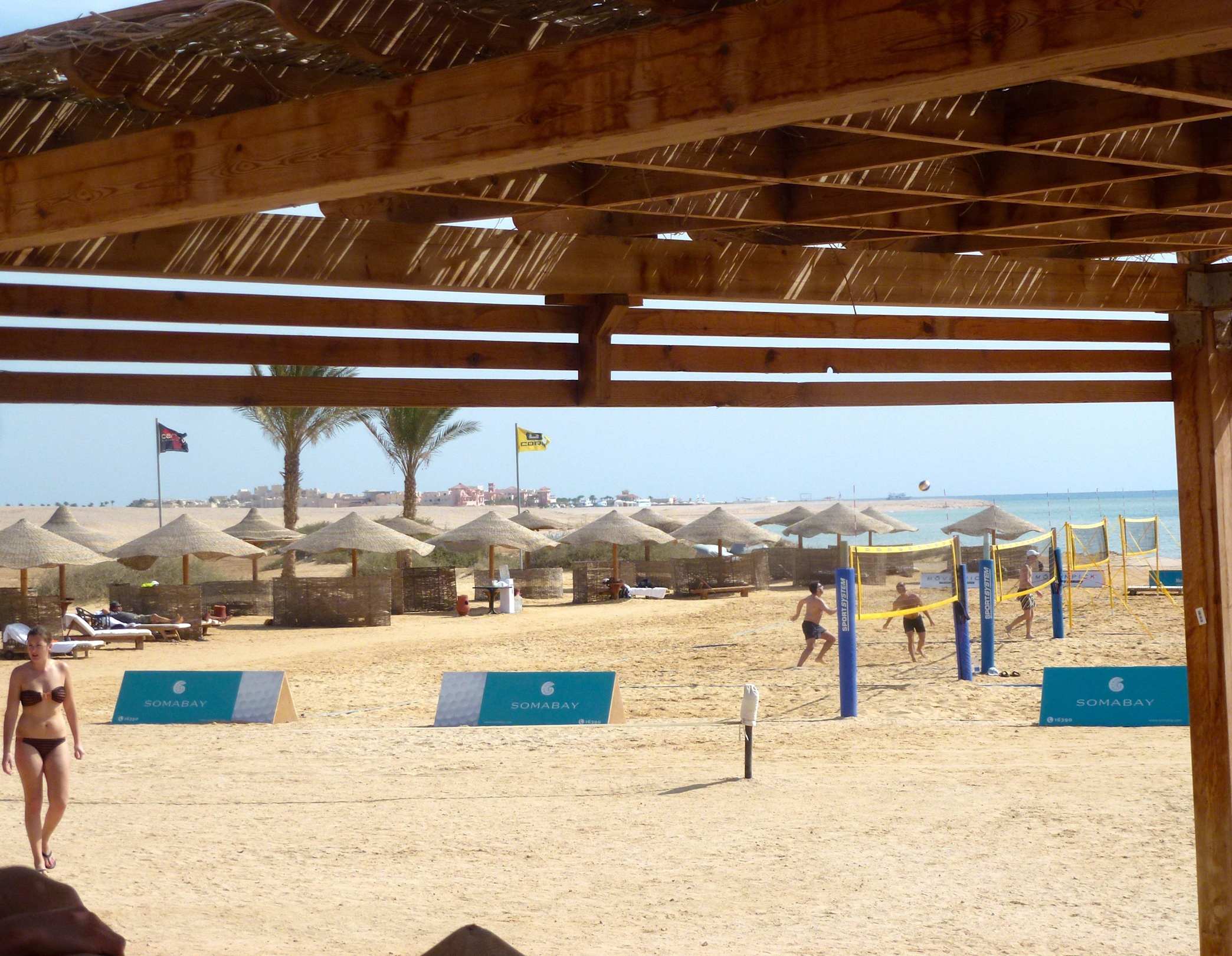 Blick vom Kite-House auf Liegen und Beachvolleybal