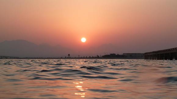 Blick vom Meer zum Sonnenuntergang