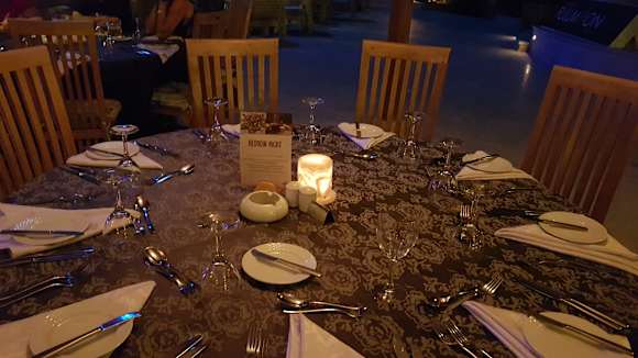 Grosse Runde Tafeln. Man setzt sich einfach irgendwo dazu das macht den Charme aus