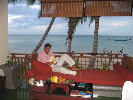LoungeDer zweite Teil unserer Beach-Pool-Villa lag unmittelbar am Strand. Tolle Aussicht, gemütliche Couch, traumhaft!
