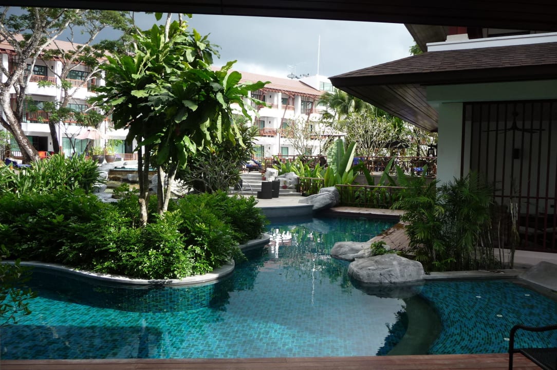 Aussicht aus einer Villa Von einer Villa hat man von der Terrasse direkten Zugang zu einem kleinen verschlungenen Pool.
