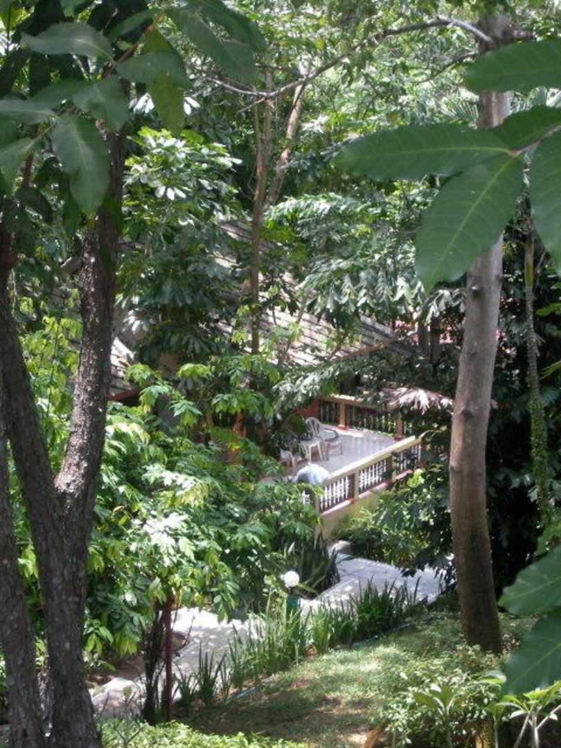 Blick vom oberen "Wasserfall" Pool auf unseren kleinen Bungalow, der direkt zwischen Palmen und anderen exotischen Bäumen stand.