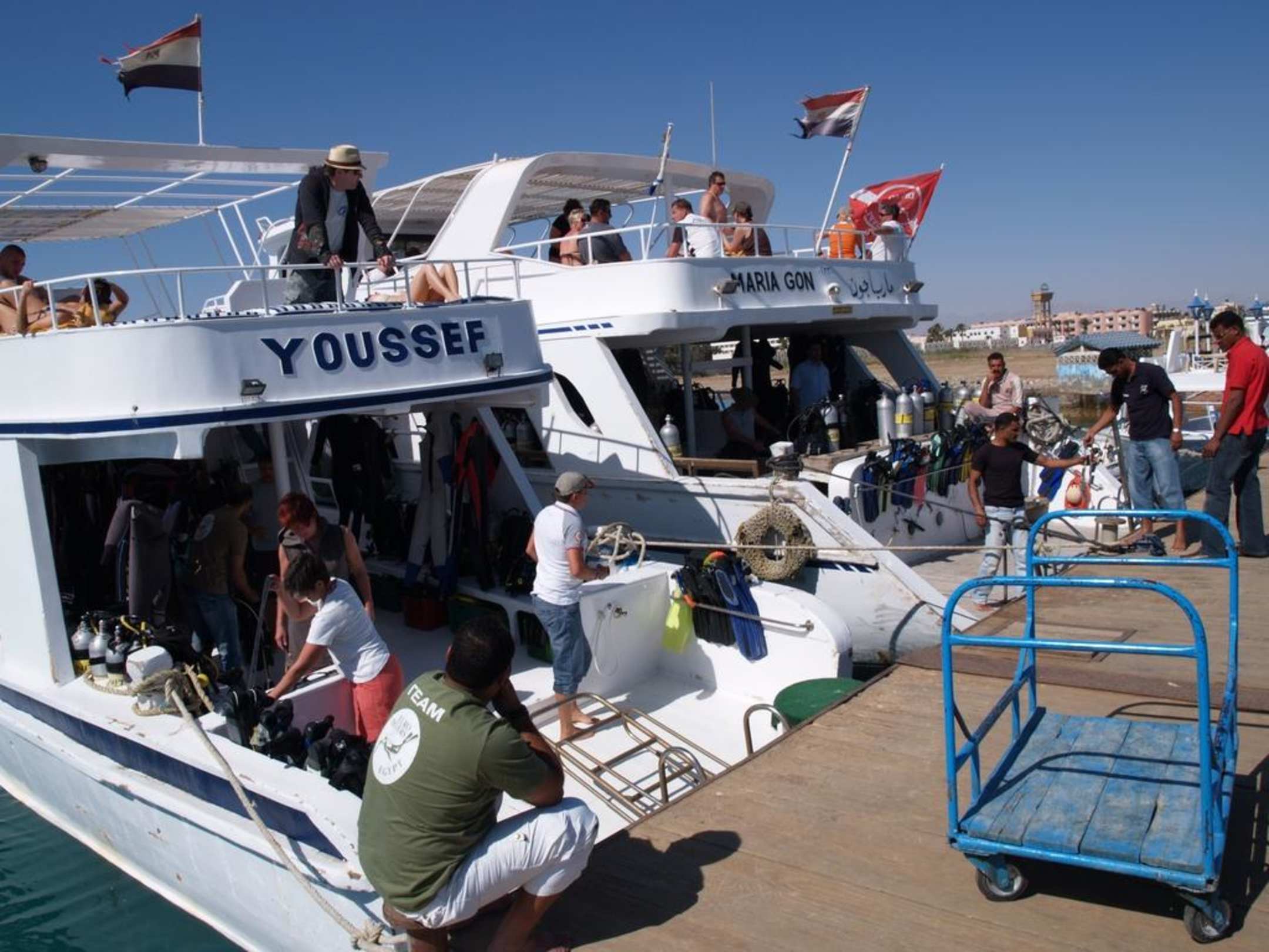 Euro-Divers AnlegerDie drei Boote der Euro-Divers Tauchbasis (Nice, Youssef und Maria-Gon) bieten täglich Tagesfahrten zum Tauchen und Schnorcheln.