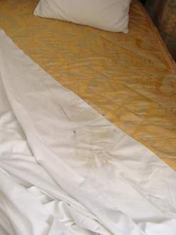 Die steinharte Matratze war eine Zumutung, das Bettlaken war unglaublich schmutzig und mit fremden Haaren überseht. Nicht am Bild, die Bettumrandung Kommt man an derer mit schwarzer Kleidung an ist sie grau-braun!!