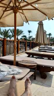 defekte und dreckige Liegen nebst Auflagen ,Krähen überall samt Kot