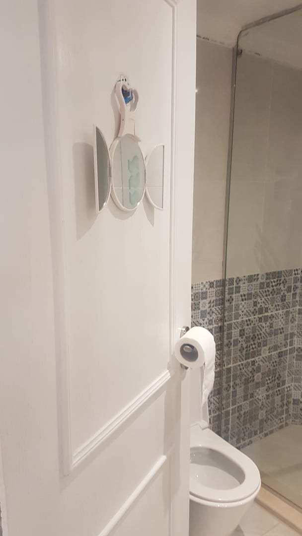 ZimmerSelbst gekaufter und gebauter Make-Up Spiegel und Toilettenpapierhalterung. Kein 5 Sterne Deluxe Standard.