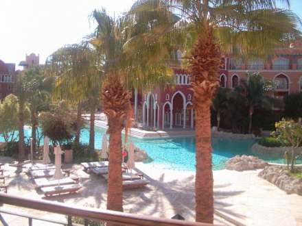 Das ist der traumhafte Blick von unserem Balcon aus auf den großen Pool.
