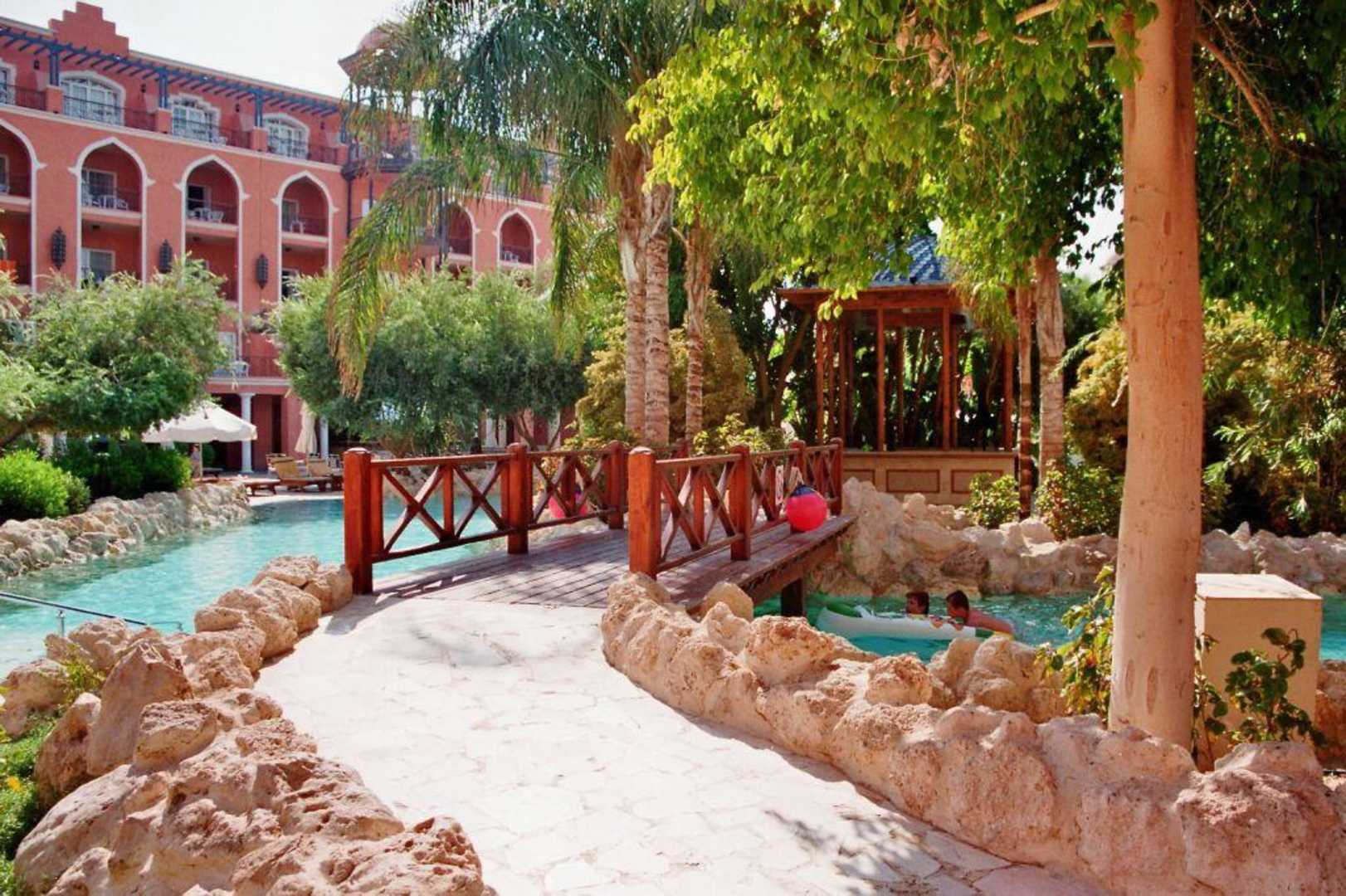 Inmitten eines Pools ist eine Bar mit offenem Grillrestaurant gelegen.