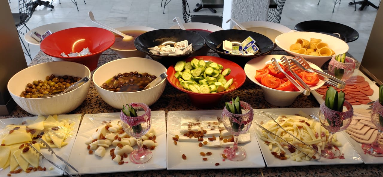 Das war das Frühstücksbuffet. Dazu kommen noch die hartgekochten Eier und eventuell Pommes. Mehr war nicht. Obst wurde überhaupt keines angeboten und das in der Türkei.