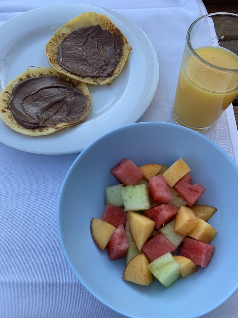 Crêpes, Orangensaft und frisches Obst zum Frühstück