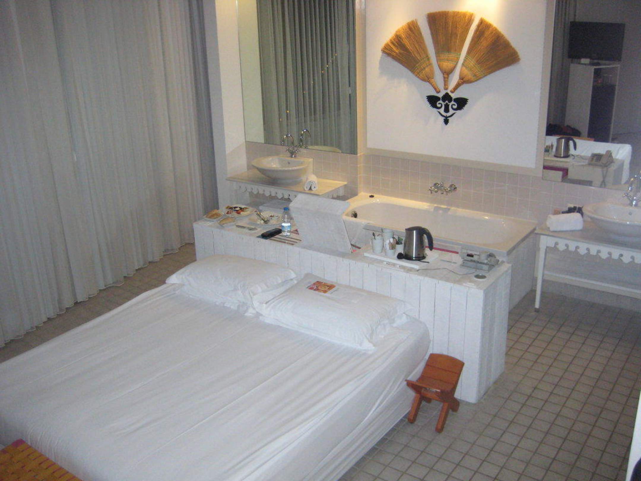 Das Bett steht mitten im Raum und die Badewanne ist direkt dahinter. Sehr witzig!
