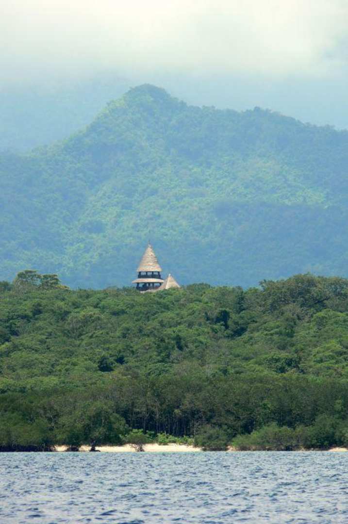 Blick vom Wasser auf den "Bali Tower" des Menjangan J+B Resort. Von dort hat man einen fantstischen Panoramablick auf die berge und das Meer. Der Bali Tower kann auch von auswärtigen Gästen besucht werden!