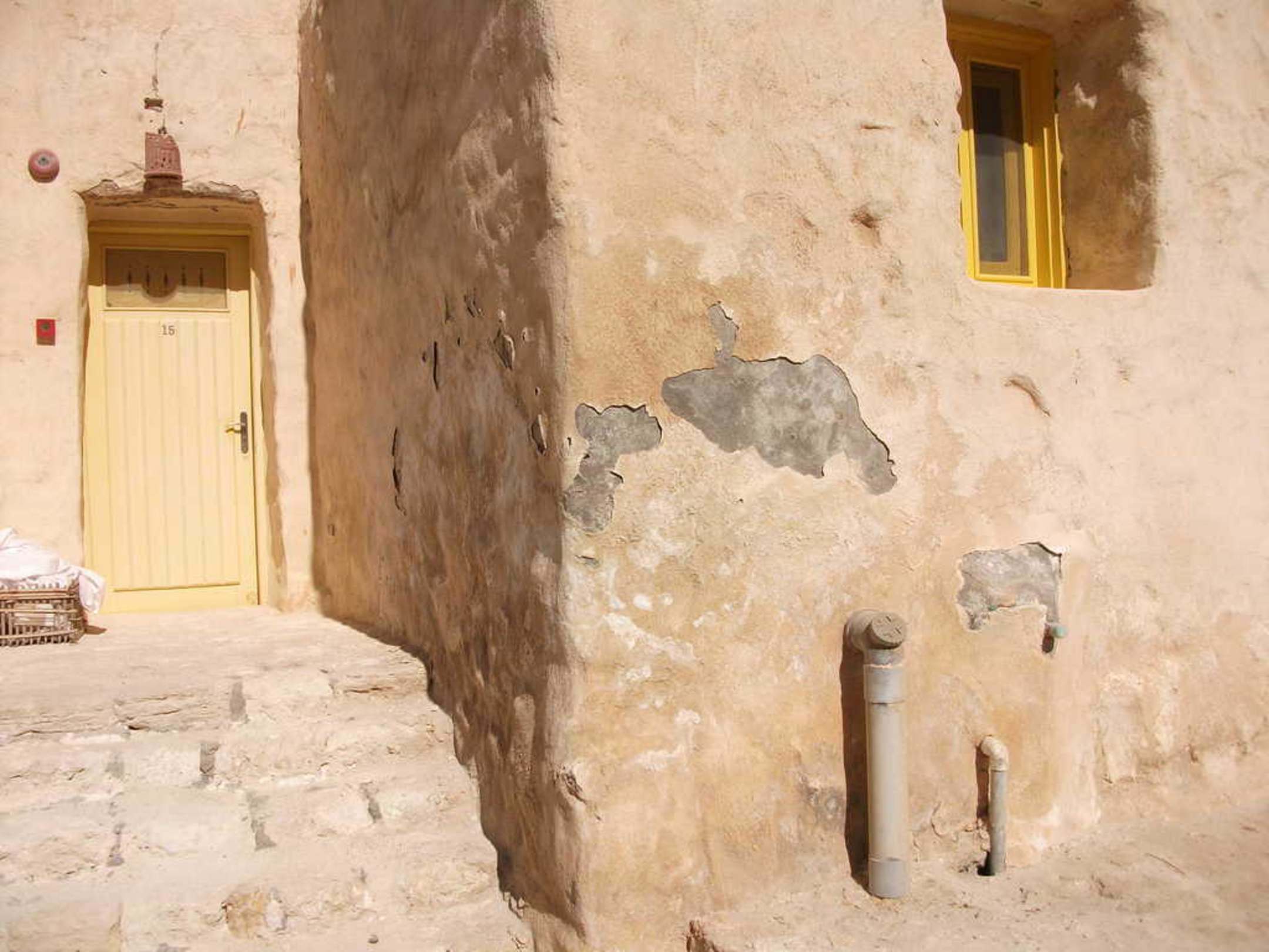 Eingangsbereich Zimmer 15Man beachte die Treppe, in der Mitte sind gar keine Stufen mehr vorhanden!!! Und die Außenwände...