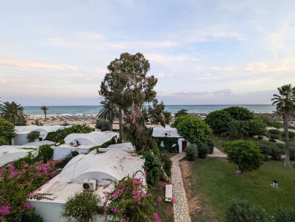 Bungalows (links) befinden sich vor dem Meerblickhaus mit direktem Anschluss an den Strand.