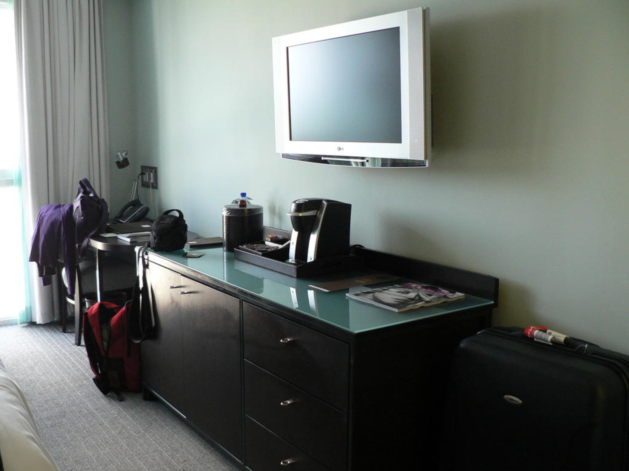 grosser Flat TV, komfortabler Schreibtisch, Kaffeemaschine im Zimmer
