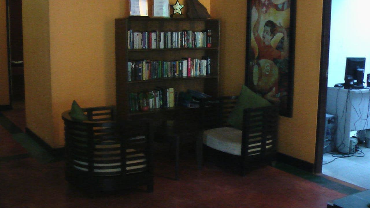 Bücherecke In der Nähe der Rezeption , sind auch einige Bücher zum schmöckern. Falls man länger lesen möchte , sind zwei Stühle davor dem Regal.