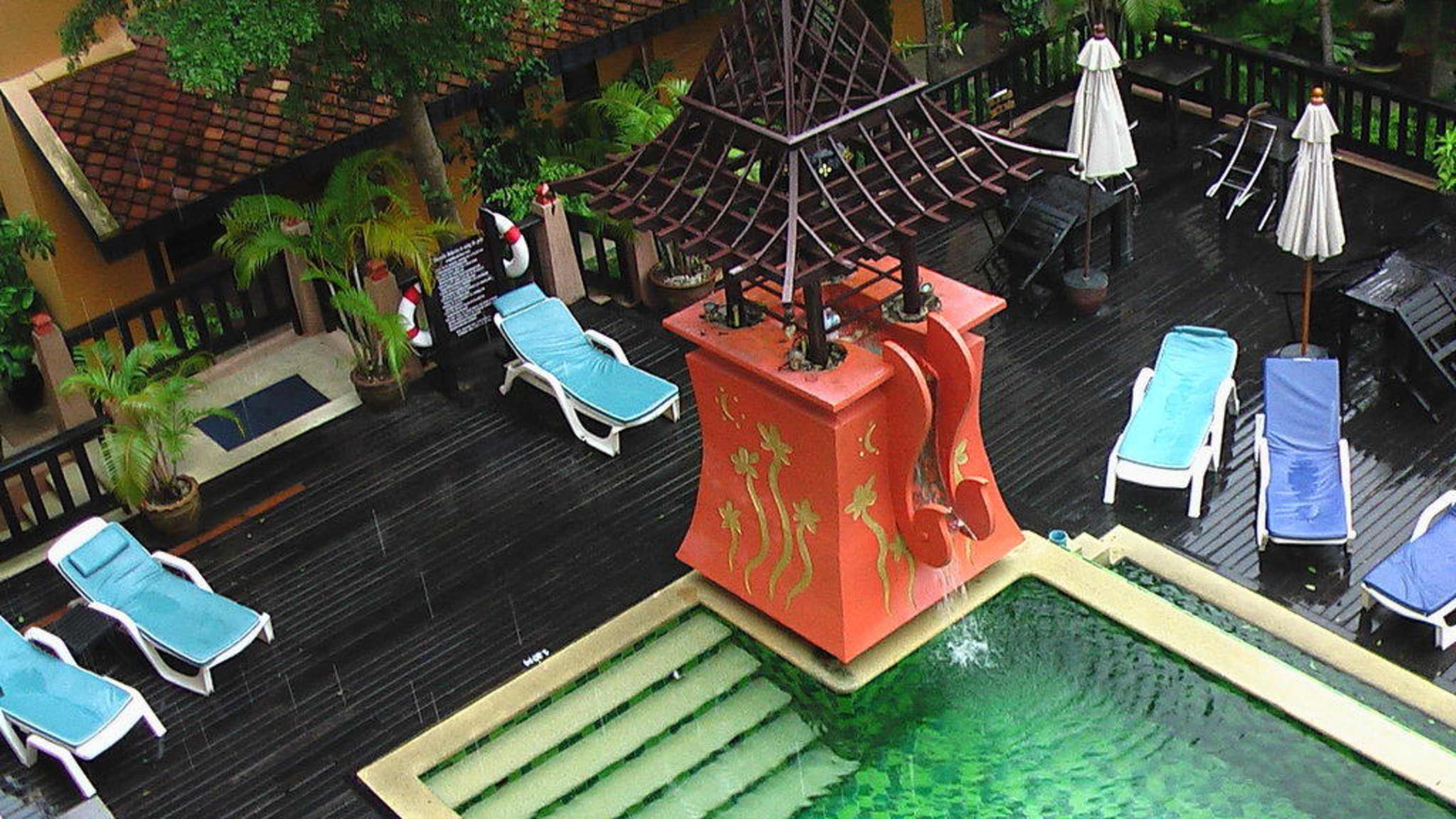Pool und Sonnenliegen Vom Balkon im 2 Stockwerk aus , sieht man im Umkreis nicht all zuviel . Den Pool mit Sonnenliegen und Sonnenschirmen.