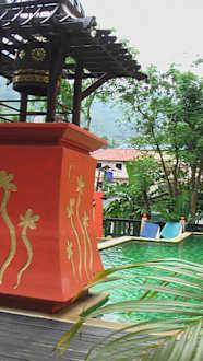 Kleine Poolanlage mit WasserspeiherDer orange Turm wälzt das Wasser um und läßt es oben wieder über eine Wasserrutsche wieder runter laufen.