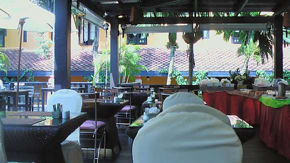 Morgens beim frühstück , sind die Stühle mit einem Sitzbezug überzogen.