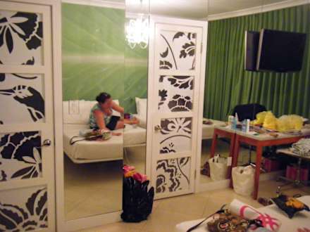 Spiegelwand auf einer SeiteDie zwei Türen führen zum Kleiderschrank (links) und Badezimmer (rechts). Entschuldigt bitte für die Unordnung.