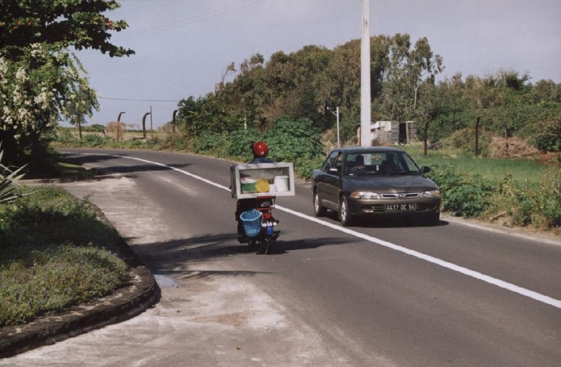 Achtung Linksverkehr :-) Und Essen auf Rädern (auf dem Mofa) für die Arbeiter.