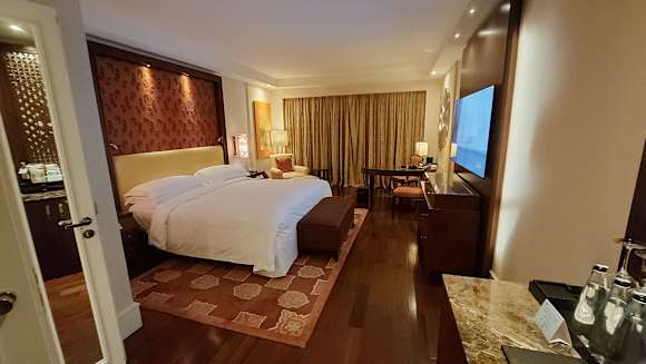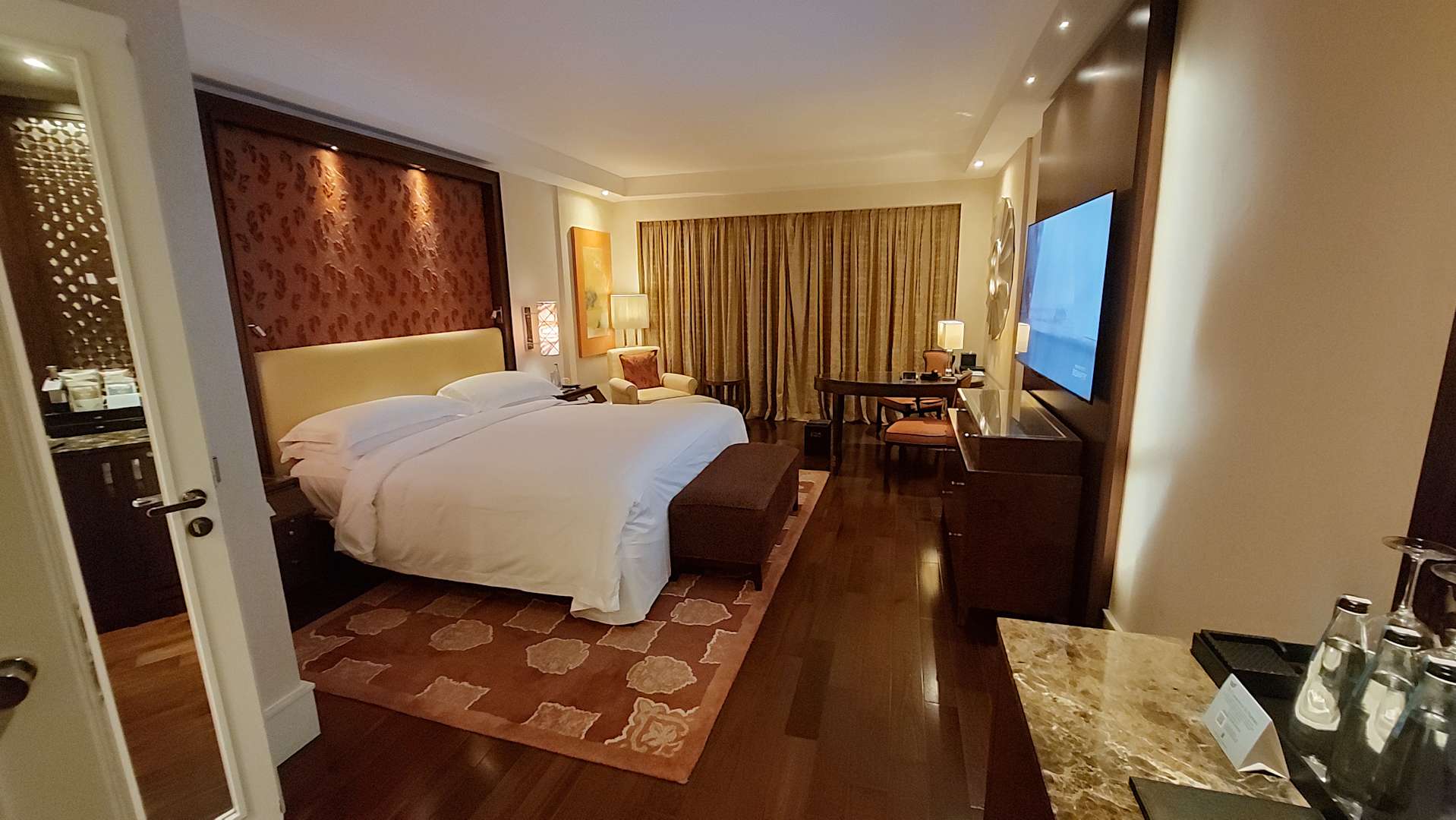 ZimmerZimmer: Großes Kingsize-Bett, dahinter rechts der Schreibtisch-Bereich und links ein weiterer Sessel.